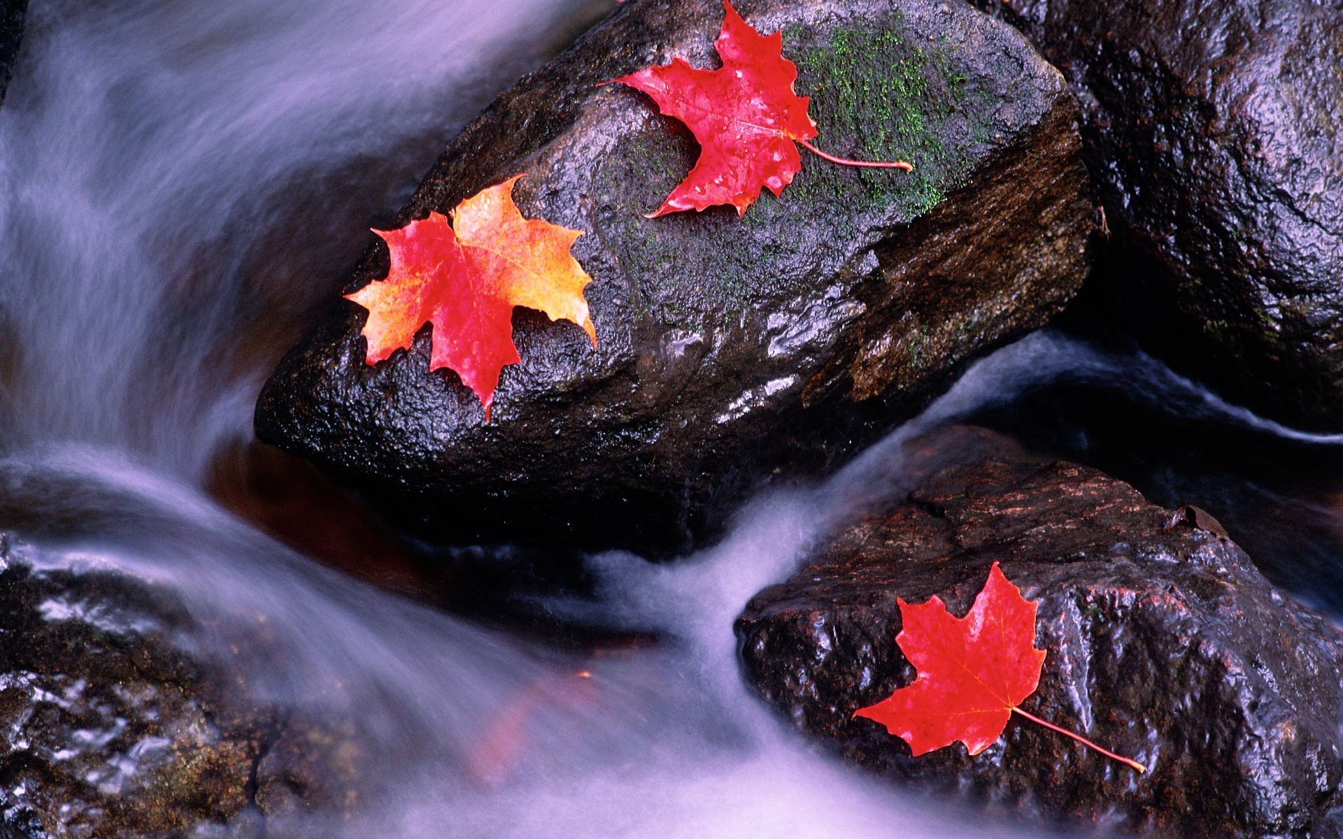 Hojas de otoño en las piedras en un arroyo