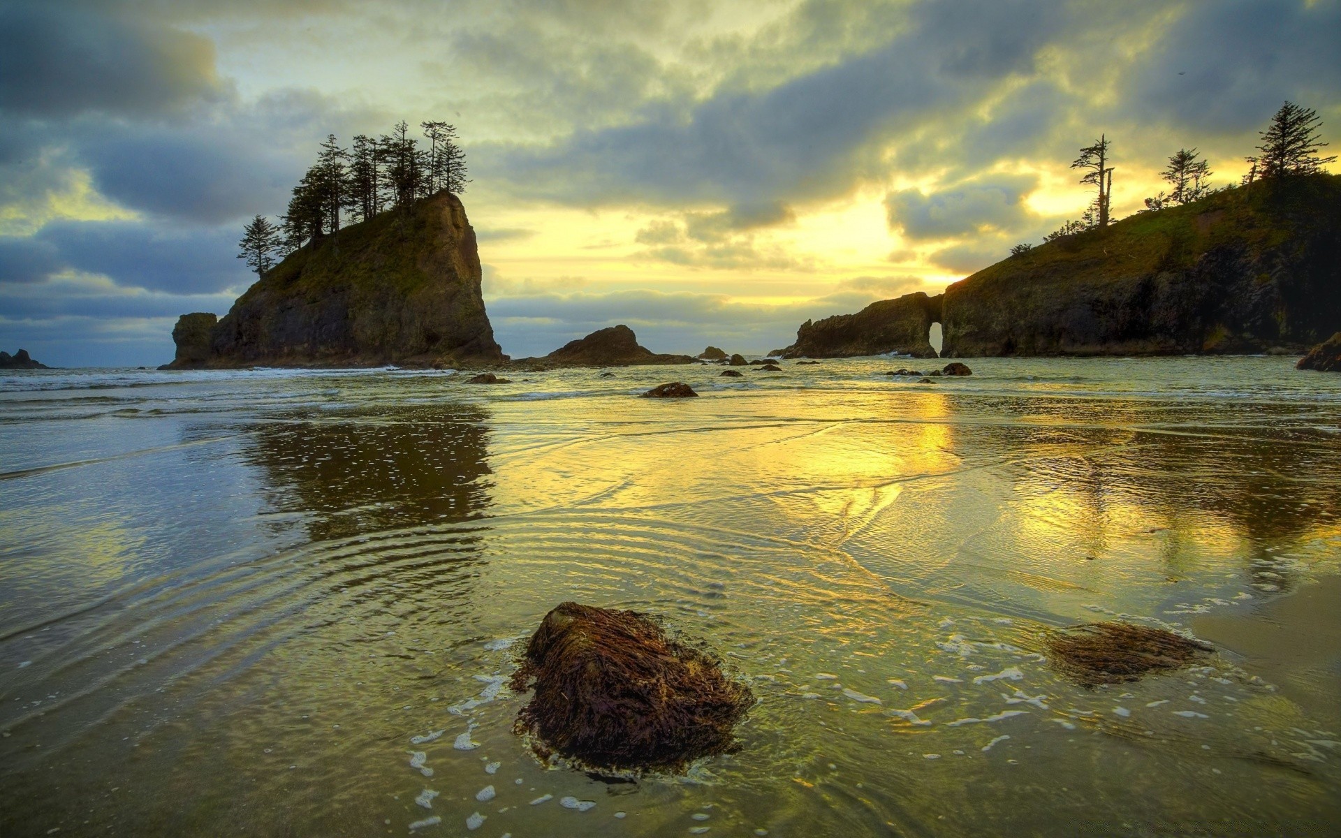 Playa salvaje con árboles y rocas