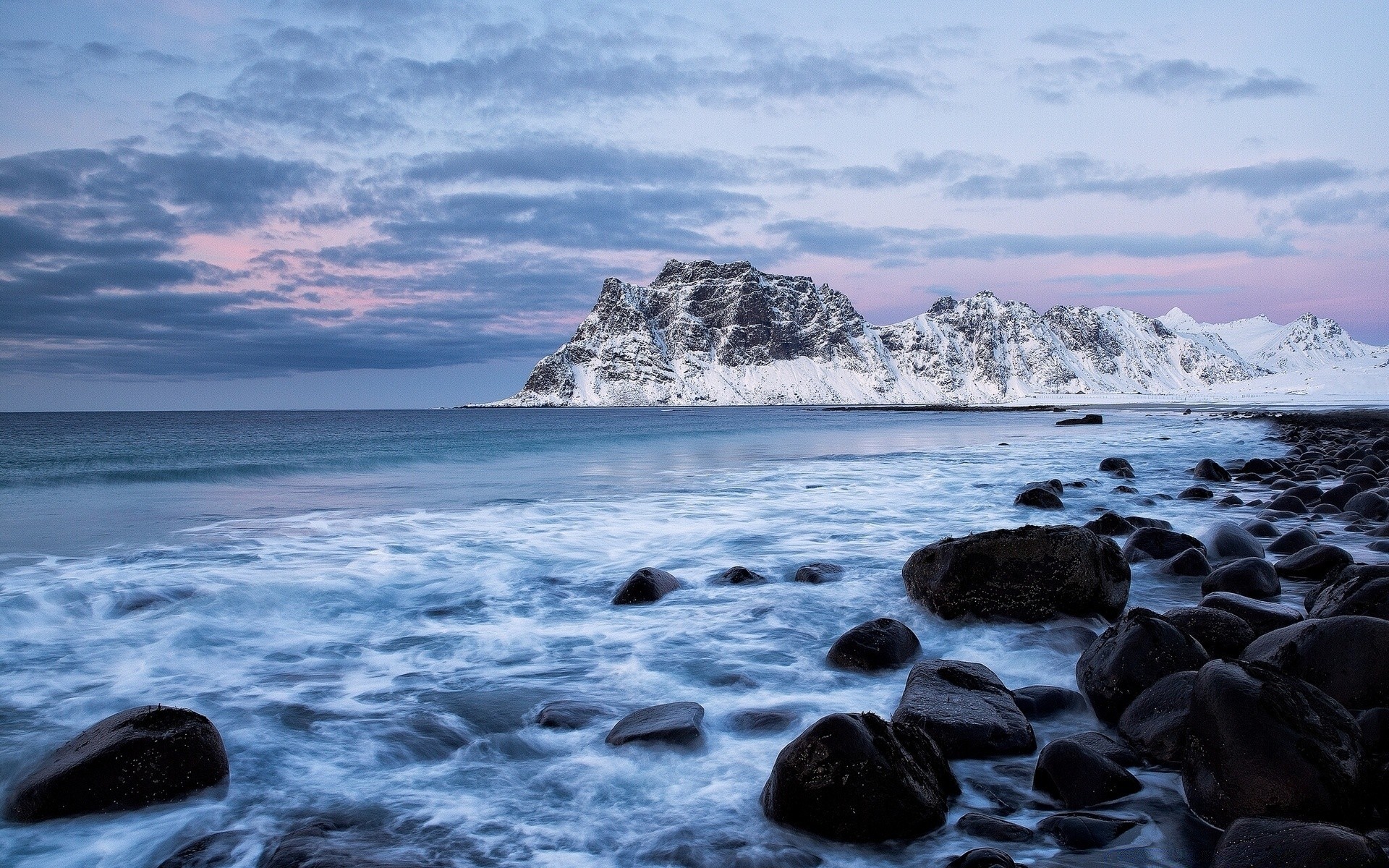 Los colores asombrosamente brillantes del paisaje con las rocas y el mar al atardecerLos colores asombrosamente brillantes del paisaje con las rocas y el mar al atardecer