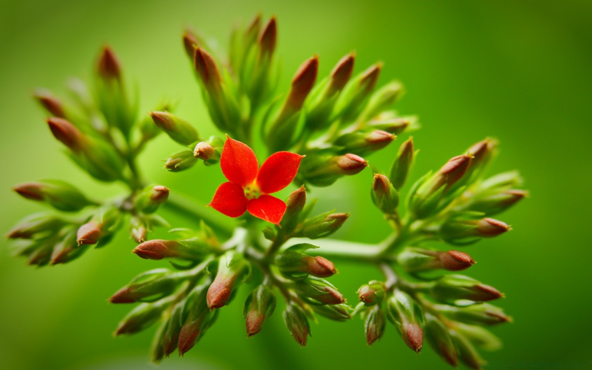 Una pequeña flor en flor de color rojo entre los brotes aún sin abrir sobre un fondo verde