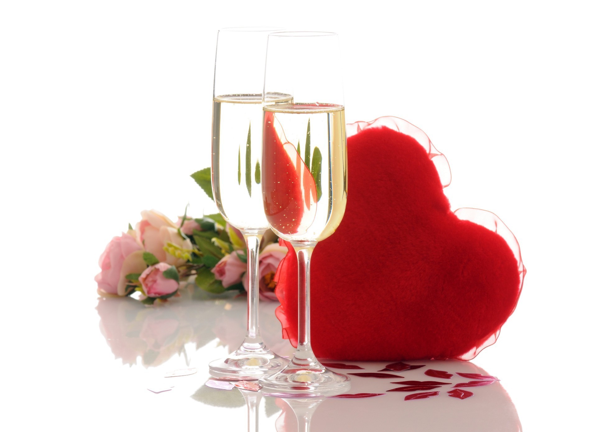 Dos copas de champán con corazón y ramo