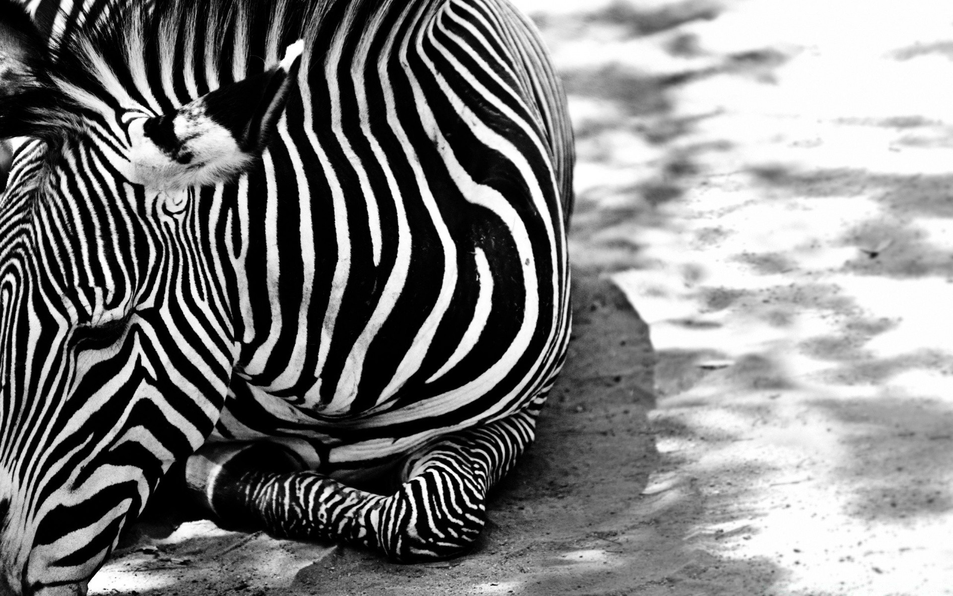 Foto CHORNO-blanco de una cebra acostada en el Suelo