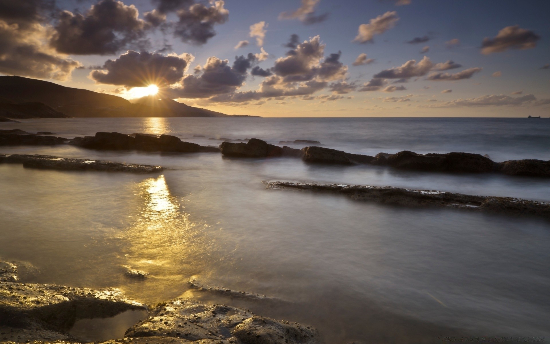 El sol apareció sobre una montaña, frente a la cual se extendía una superficie de agua