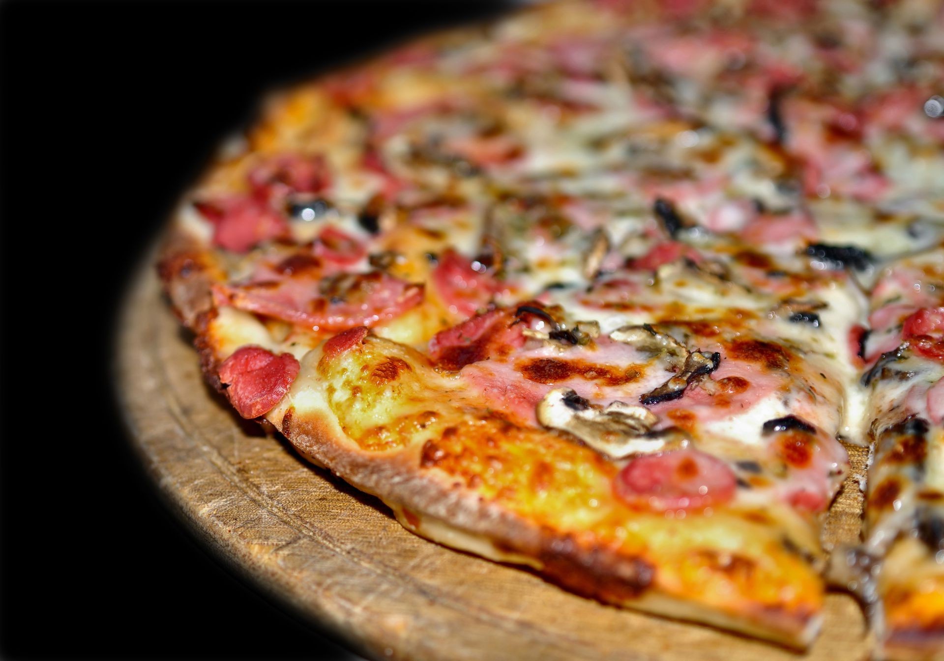 Una rebanada de pizza en primer plano sobre un fondo negro