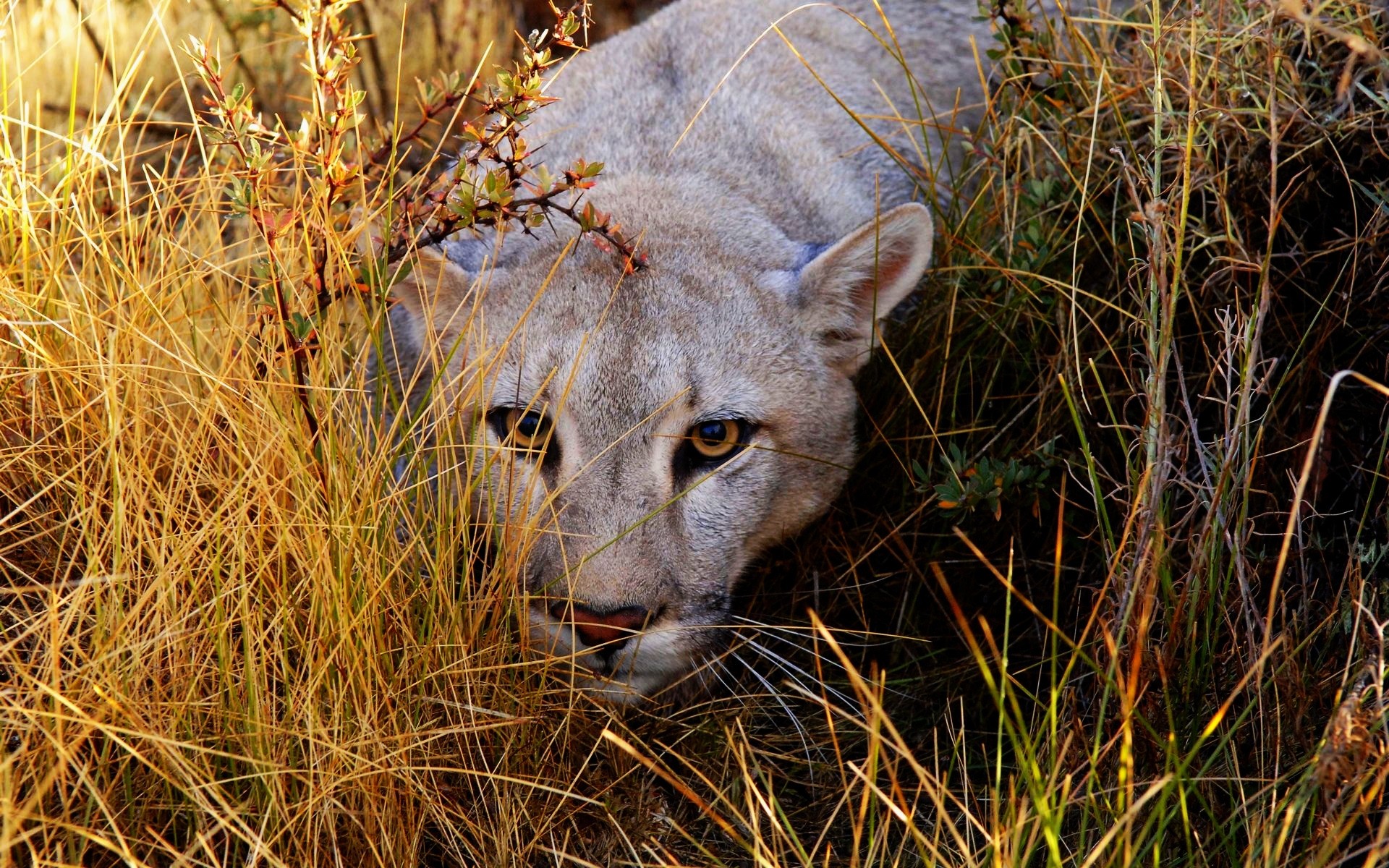 Escabulléndose Leona en la hierba amarilla
