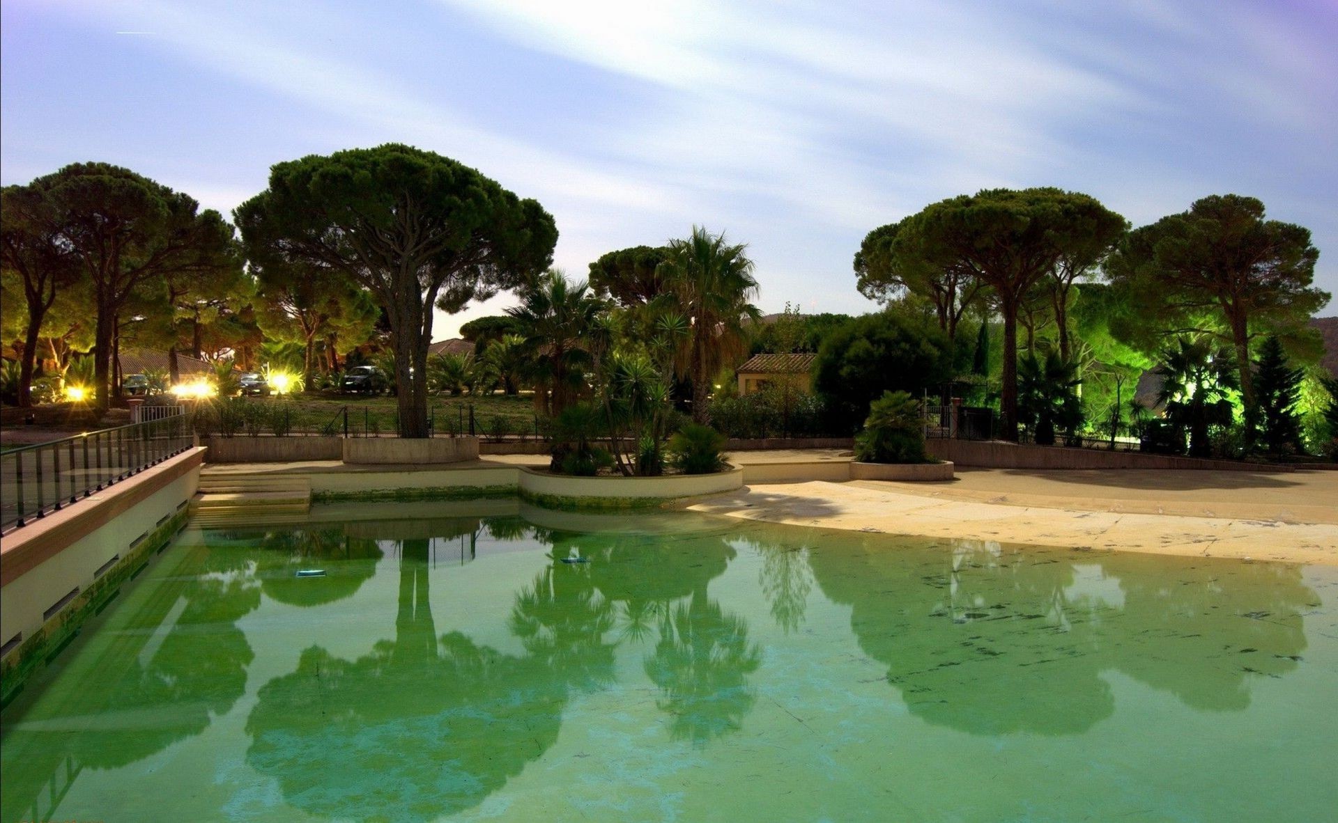 Paisaje de parque tropical con piscina verde