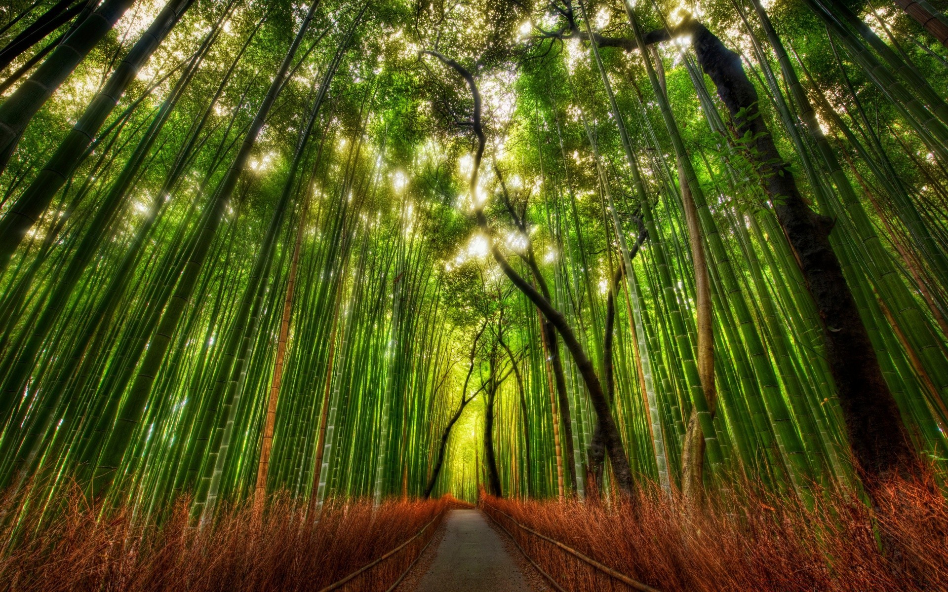 Árboles cubiertos de musgo en un bosque sombrío iluminado por el sol