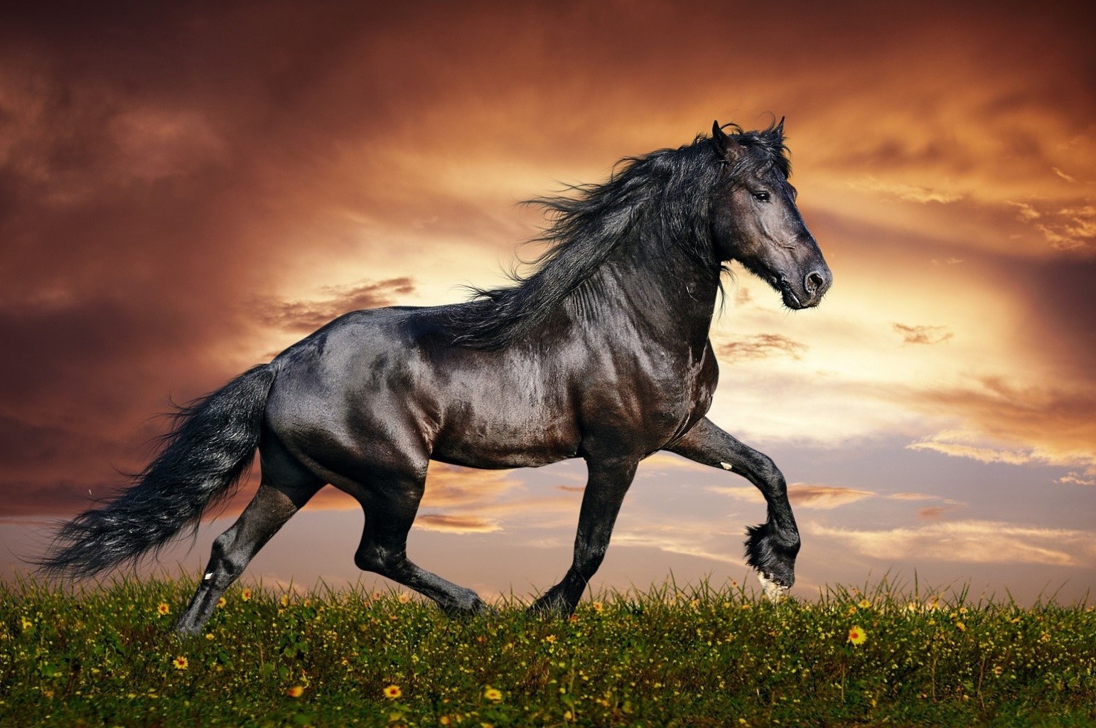 Caballo negro corriendo por el campo