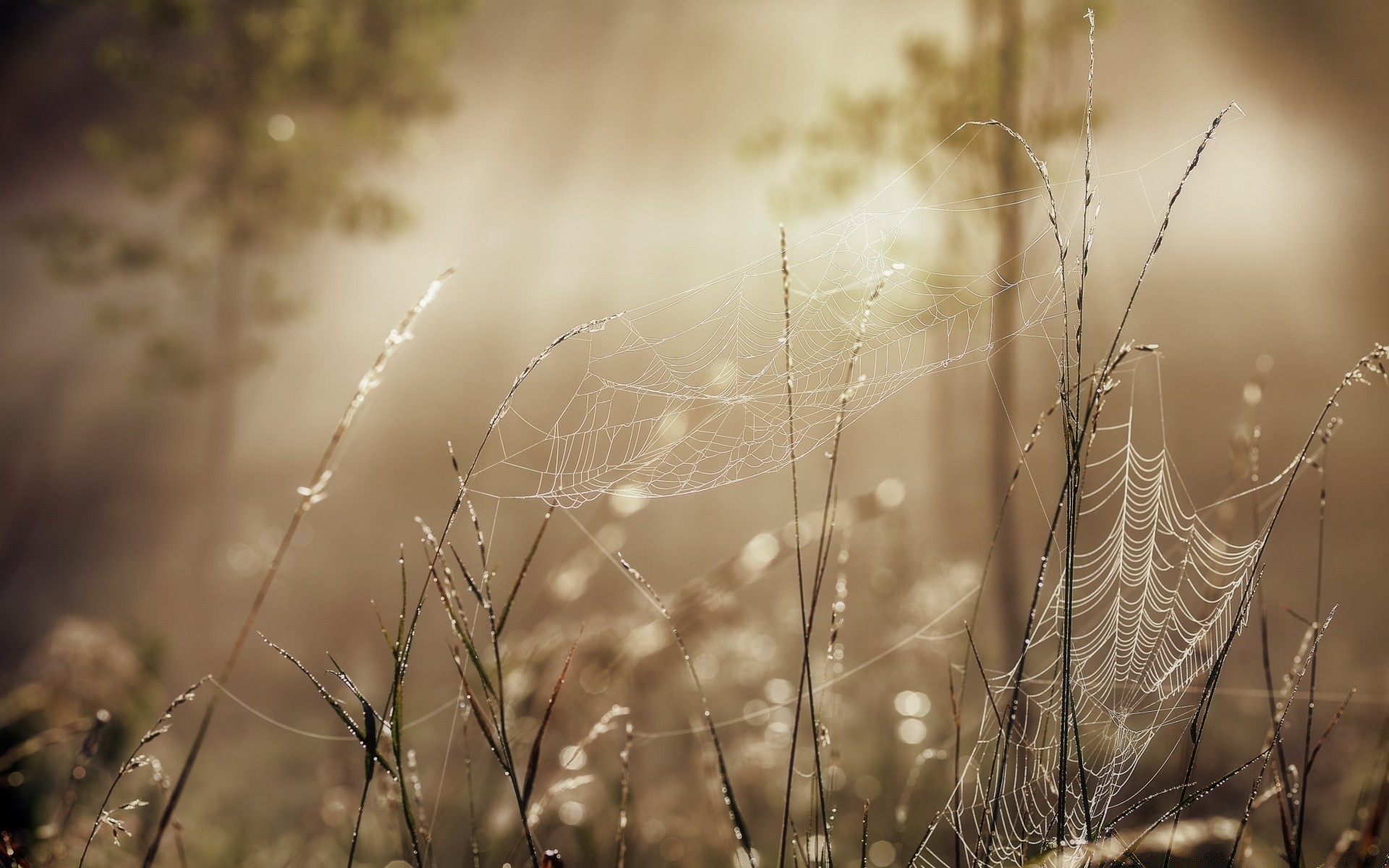 Una telaraña delicada. Telarañas en la hierba. Verano