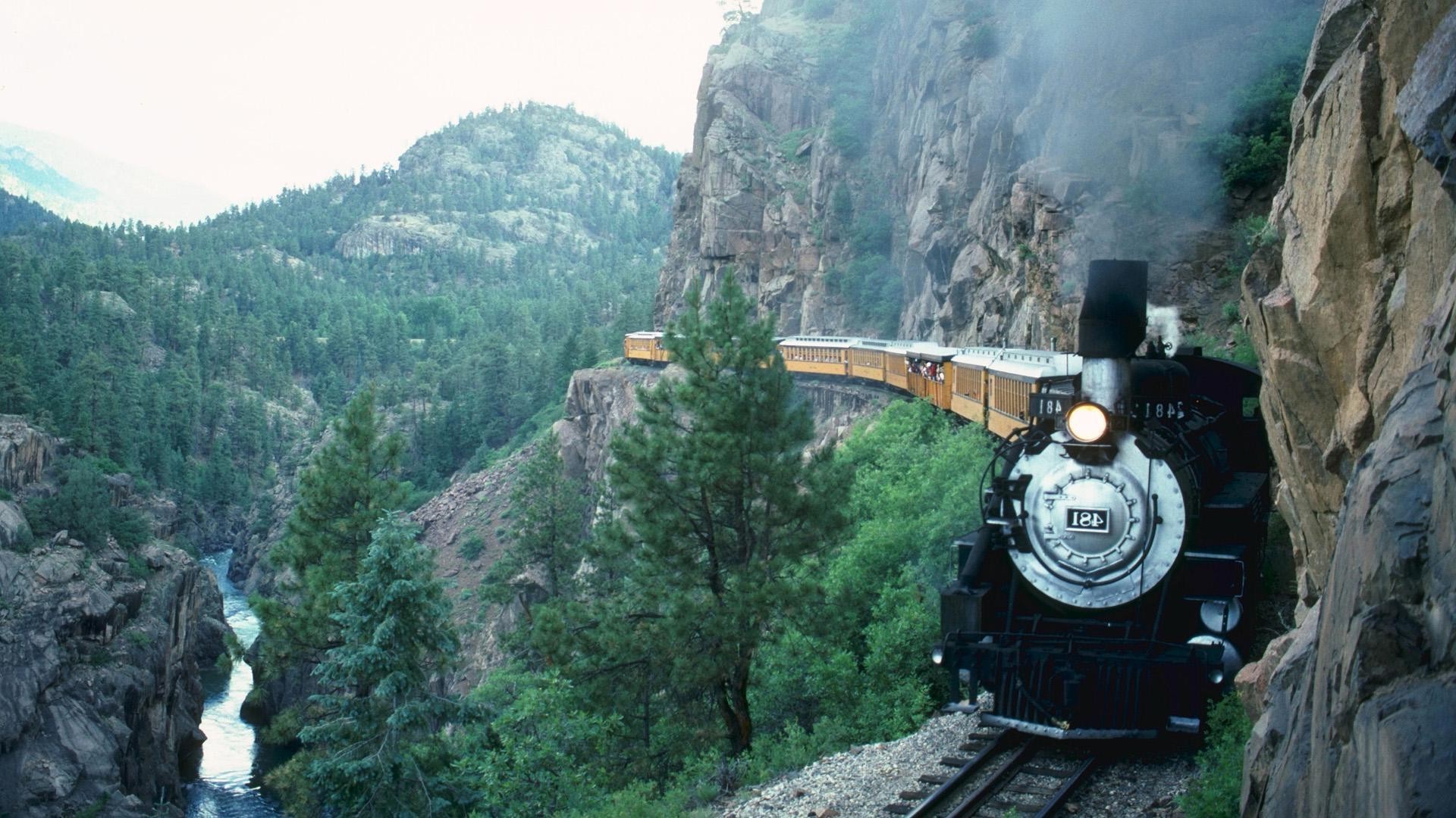 En medio de un hermoso paisaje de montañas, un tren viaja