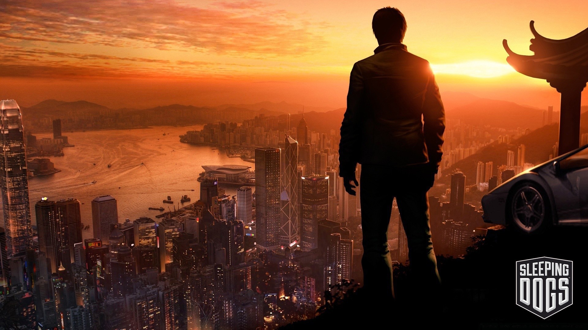 El hombre Mira la puesta de sol en la ciudad