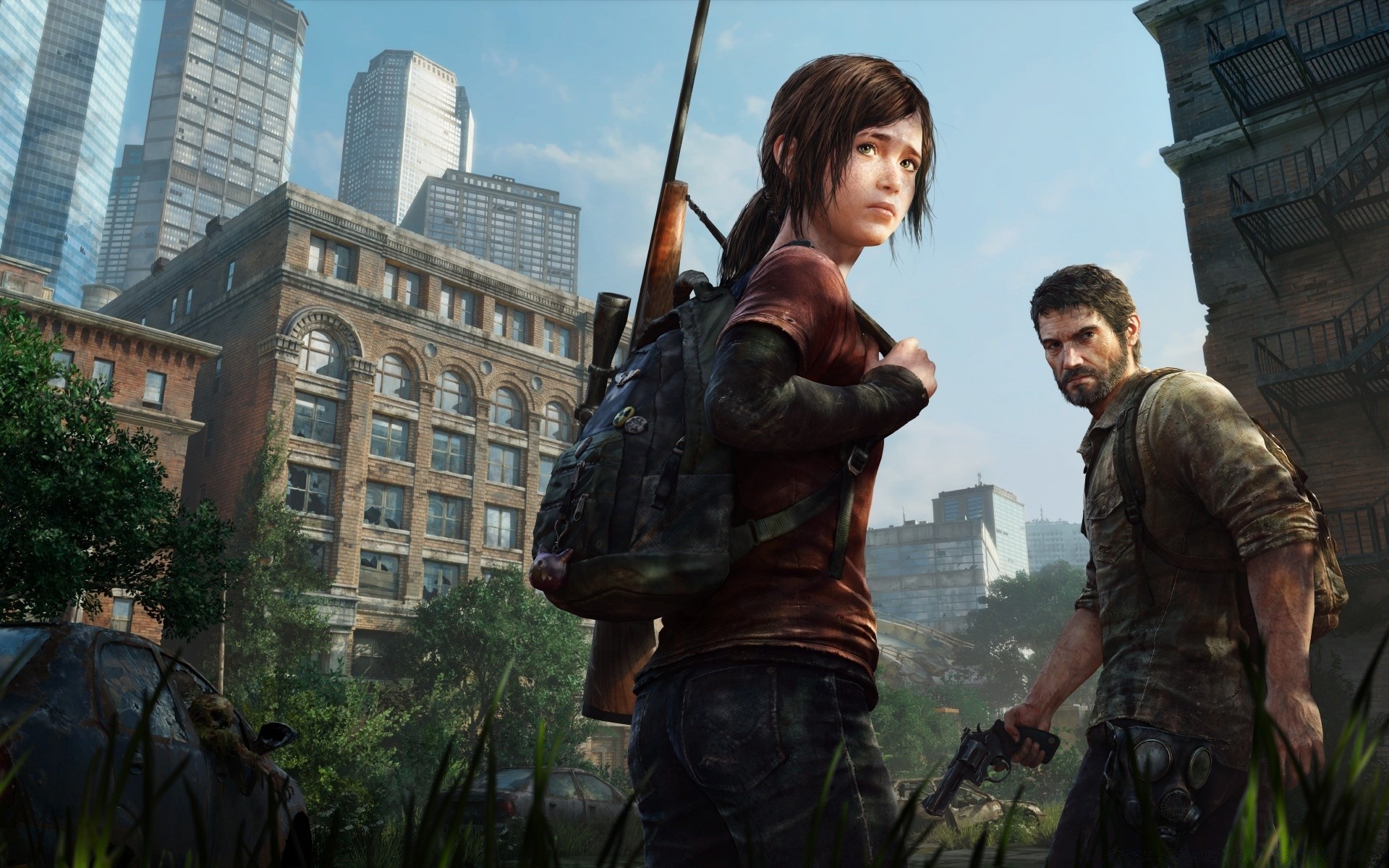 Chica francotirador y hombre en la guerra en la ciudad