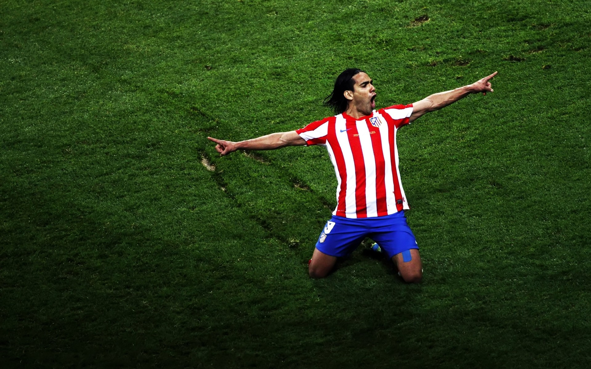 El futbolista que marcó el gol en el uniforme rojo azul se regocija de rodillas