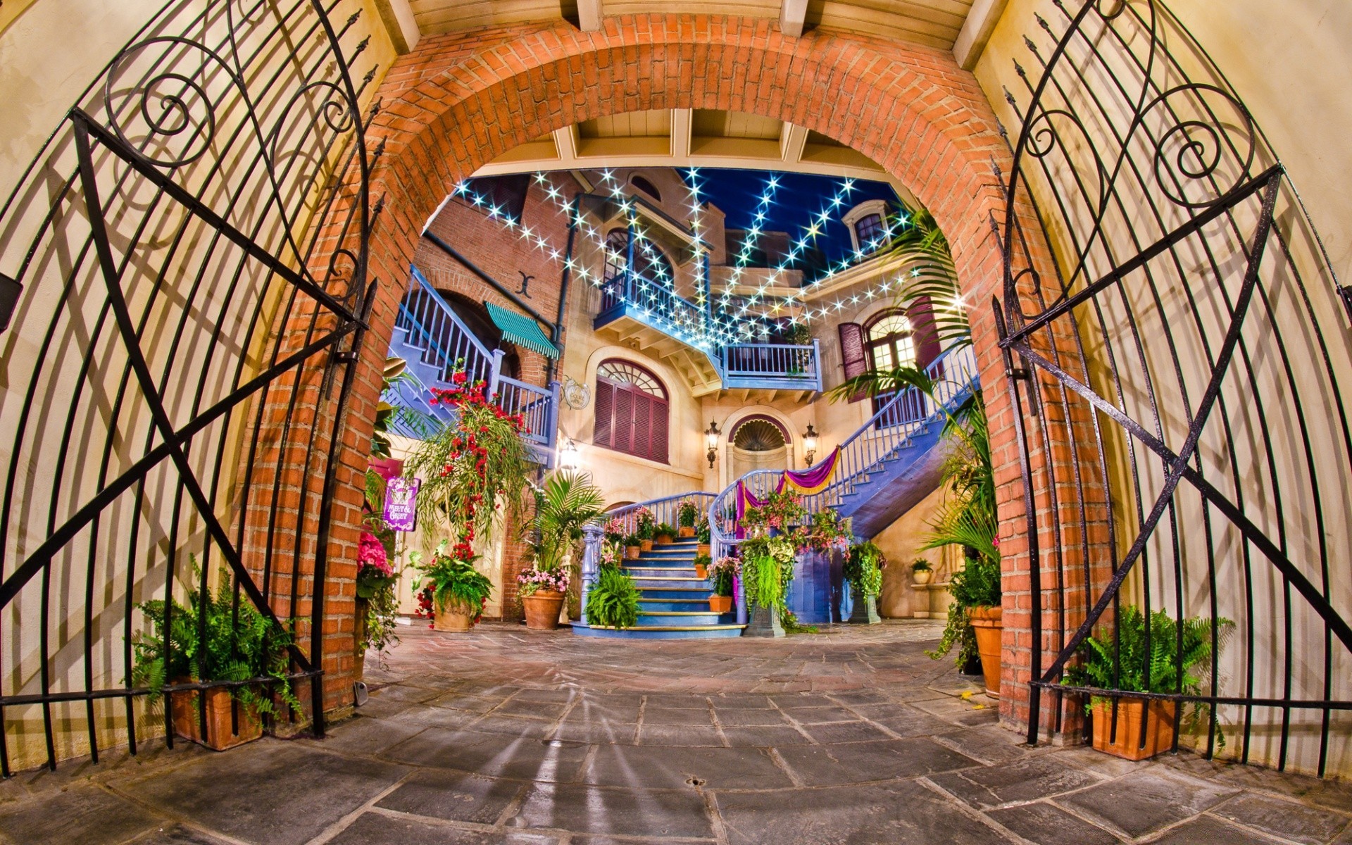 Acogedor patio luminoso detrás de la puerta abierta