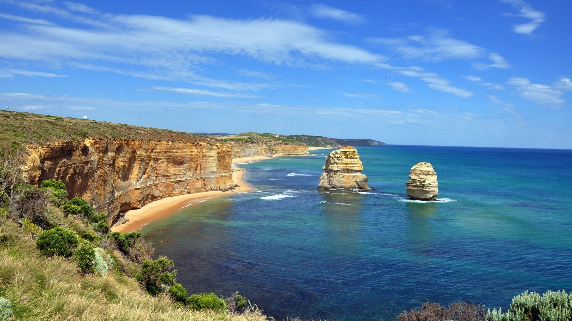 Cabañas en montañas verdes bajo un cielo azul abierto con nubes