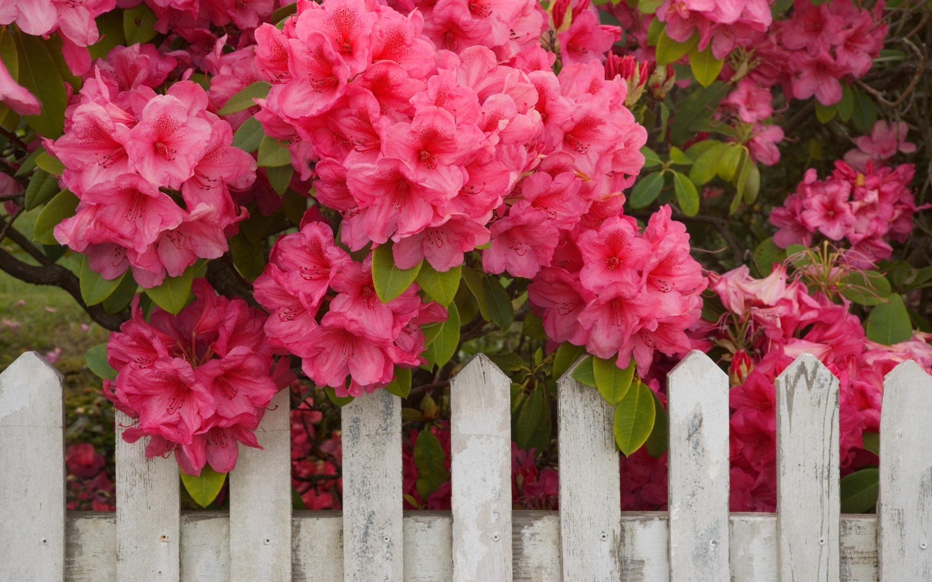 Las flores rojas del arbusto cuelgan sobre la cercaLas flores rojas del arbusto cuelgan sobre la cerca