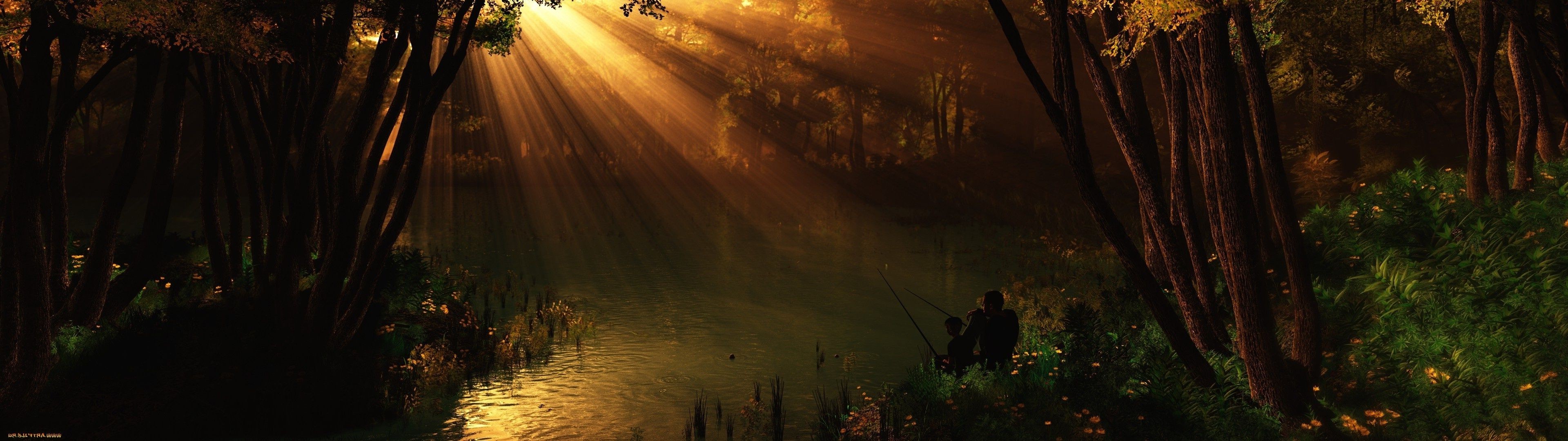 Puesta de sol junto al lago. Un arbusto solitario se cierne sobre el agua