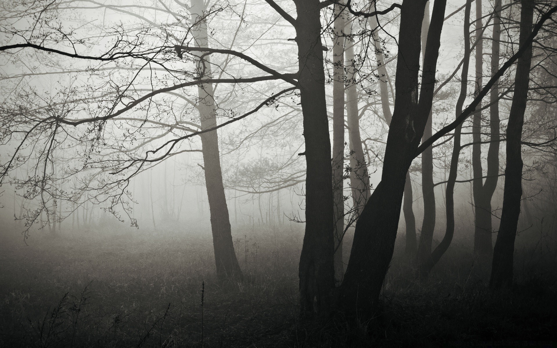 Brumoso bosque sombrío de otoño