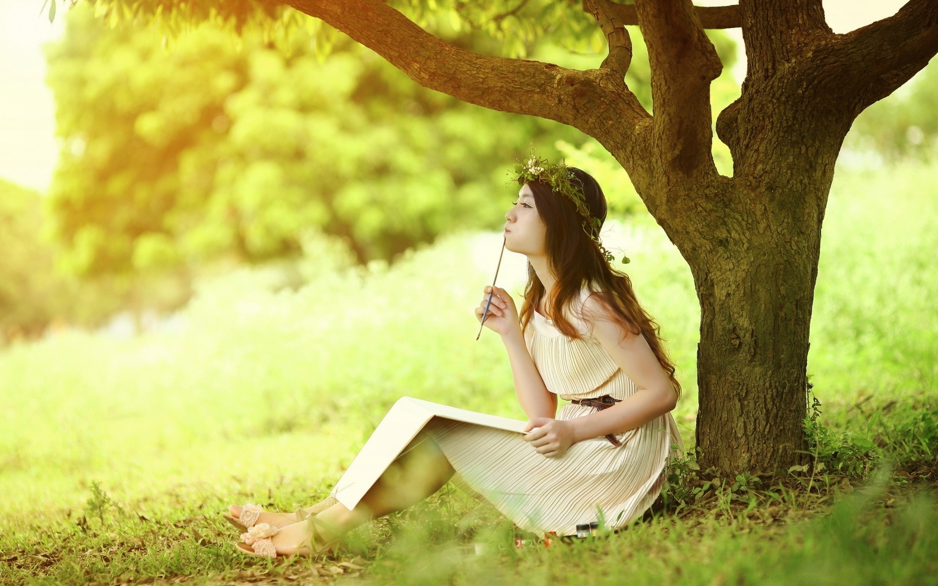 Una chica en un Jardín bajo un árbol escribe sus memorias