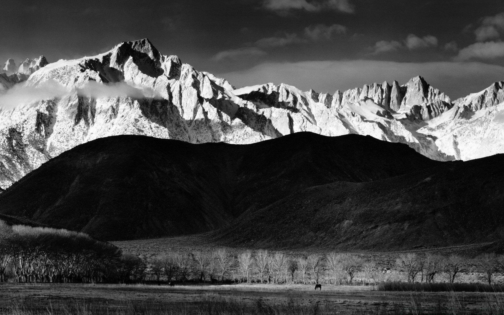 Foto en blanco y negro paisaje de las montañas del arroyo y el cañón
