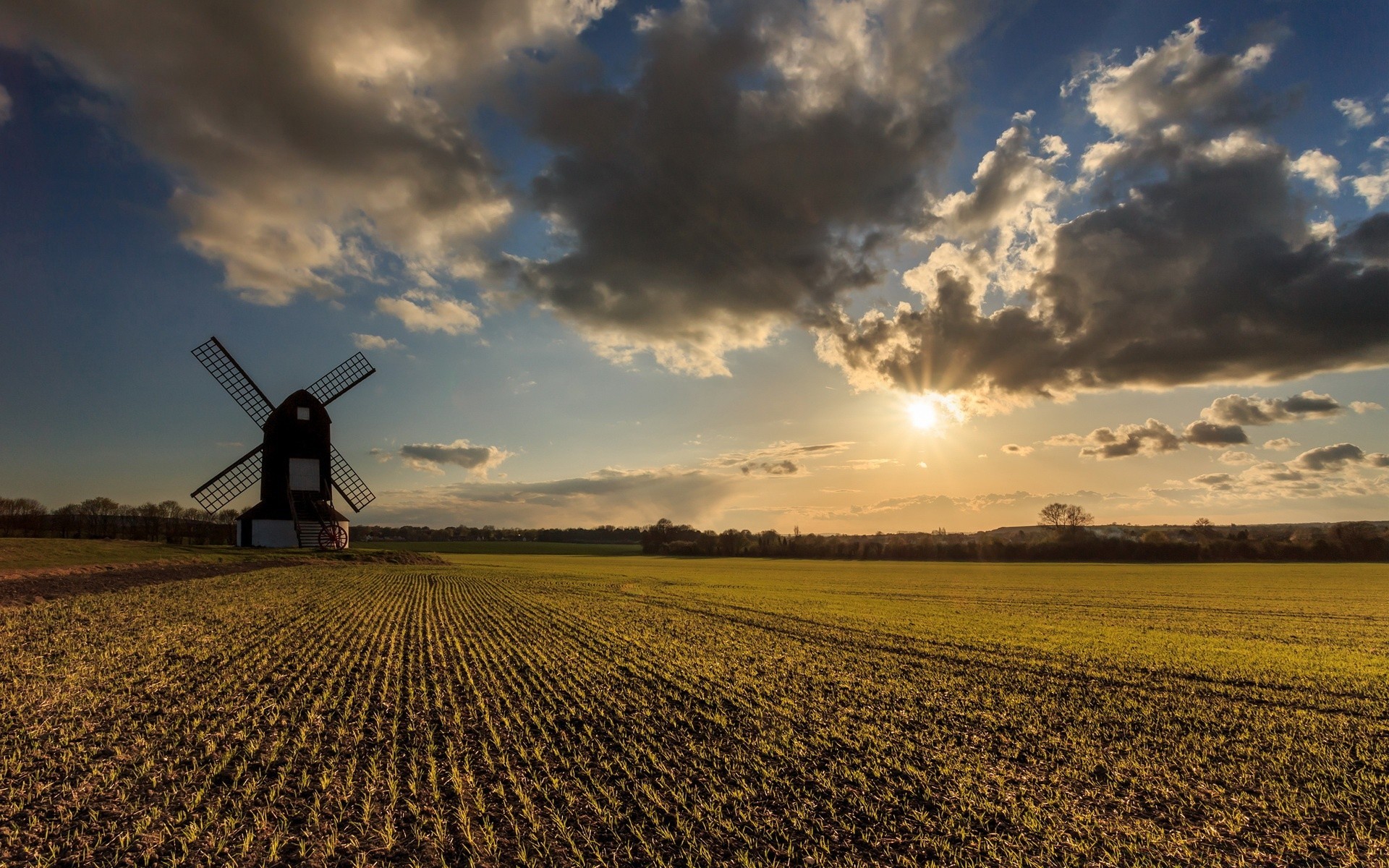 Nubes y sol sobre el molino en el campo