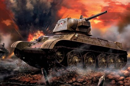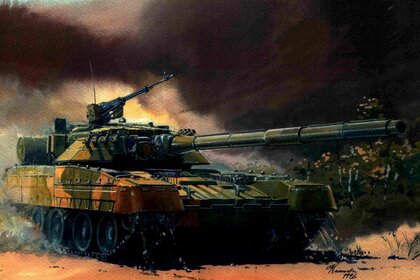 En una foto militar, un tanque se mueve en el humo entre las llamas ardientesEn una foto militar, un tanque se mueve en el humo entre las llamas ardientes