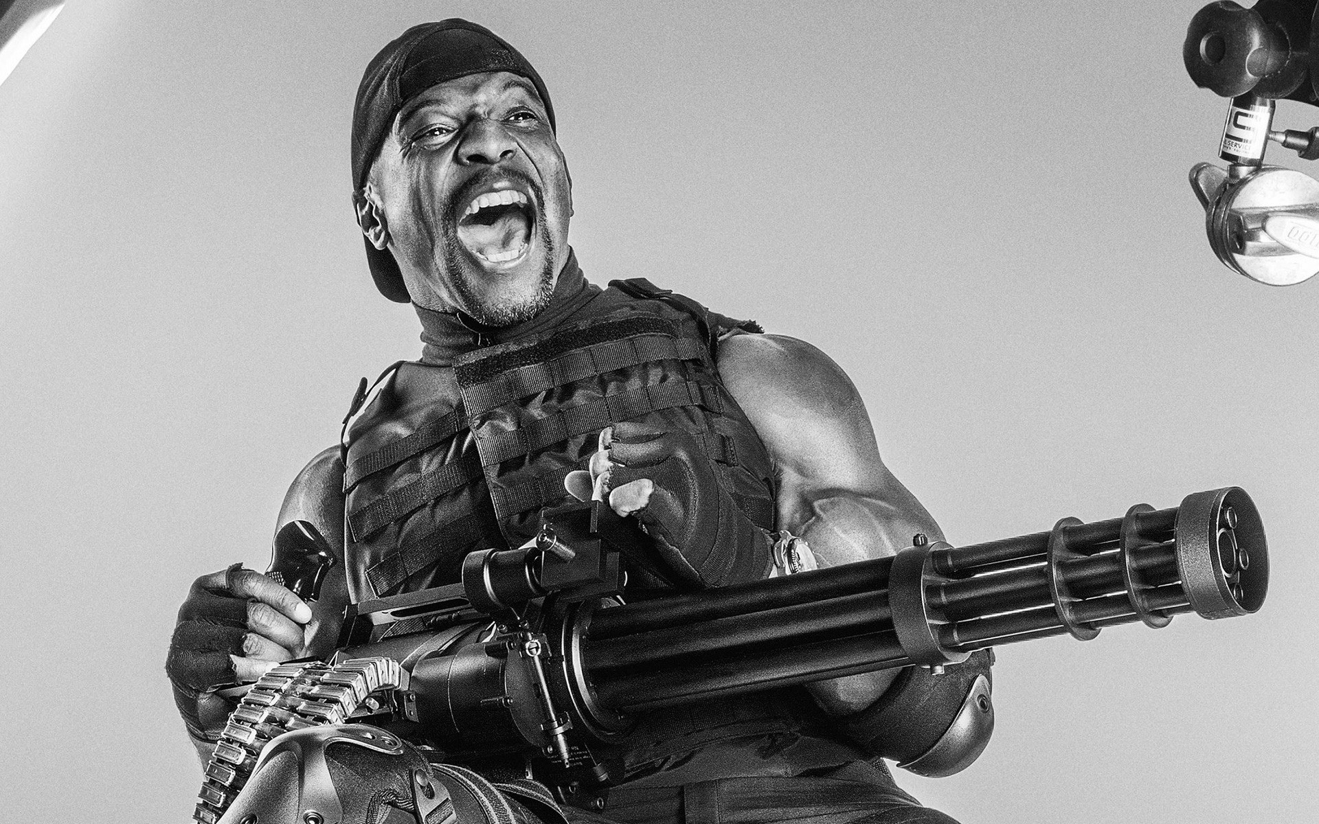 Hombre de piel oscura con gorra y chaleco antibalas sostiene una ametralladora