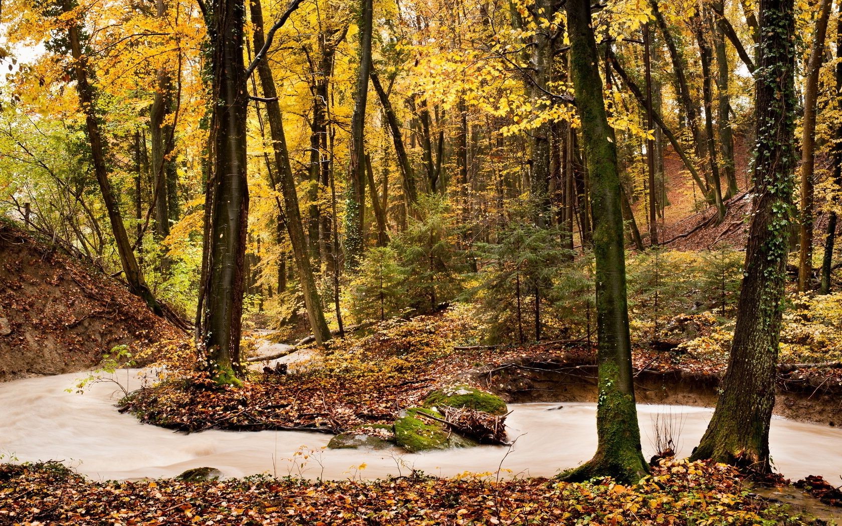 Contraste brillante de rojo y verde. Paisaje de otoño