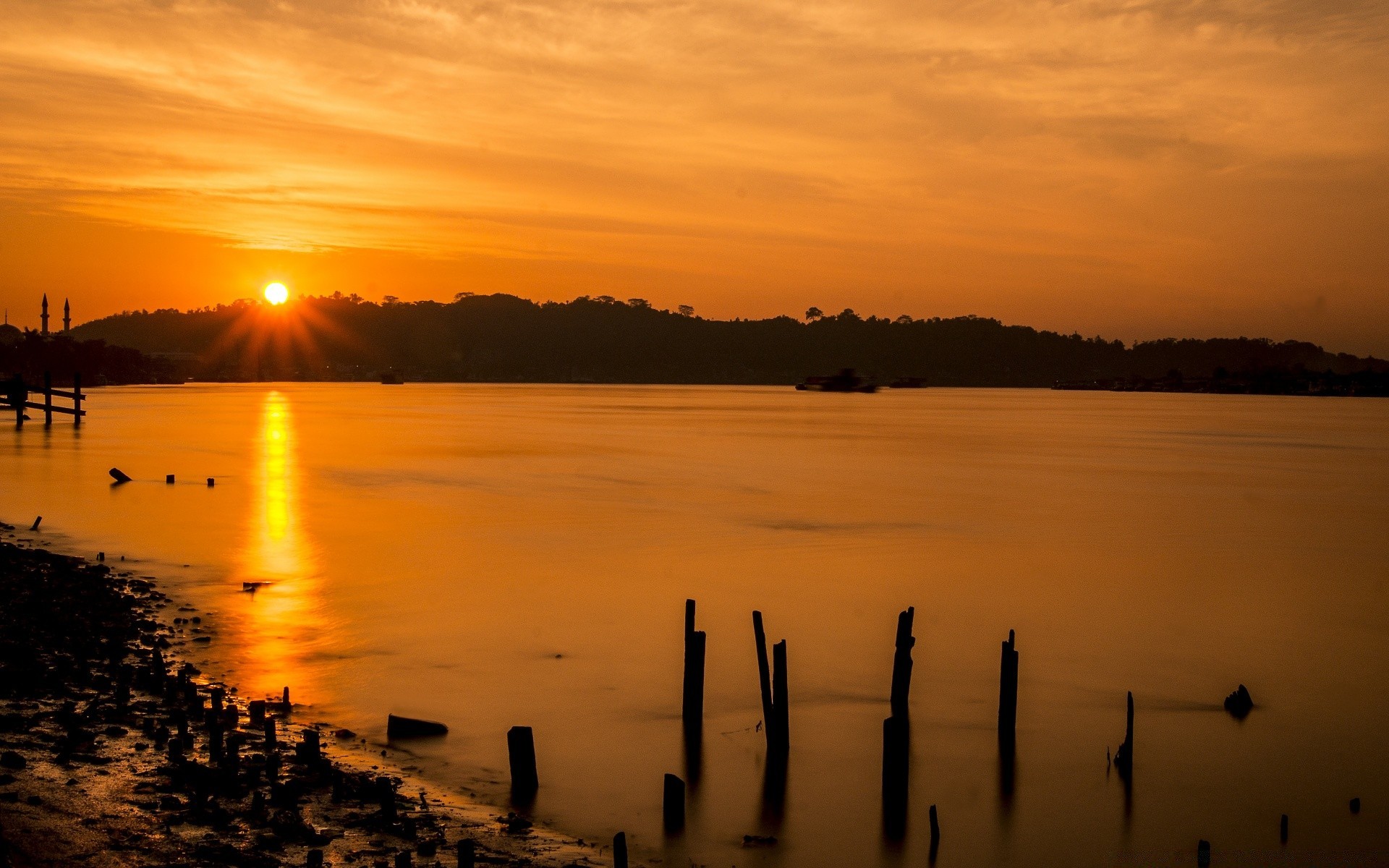 Brillante puesta de sol en el anochecer junto al aguaBrillante puesta de sol en el anochecer junto al agua