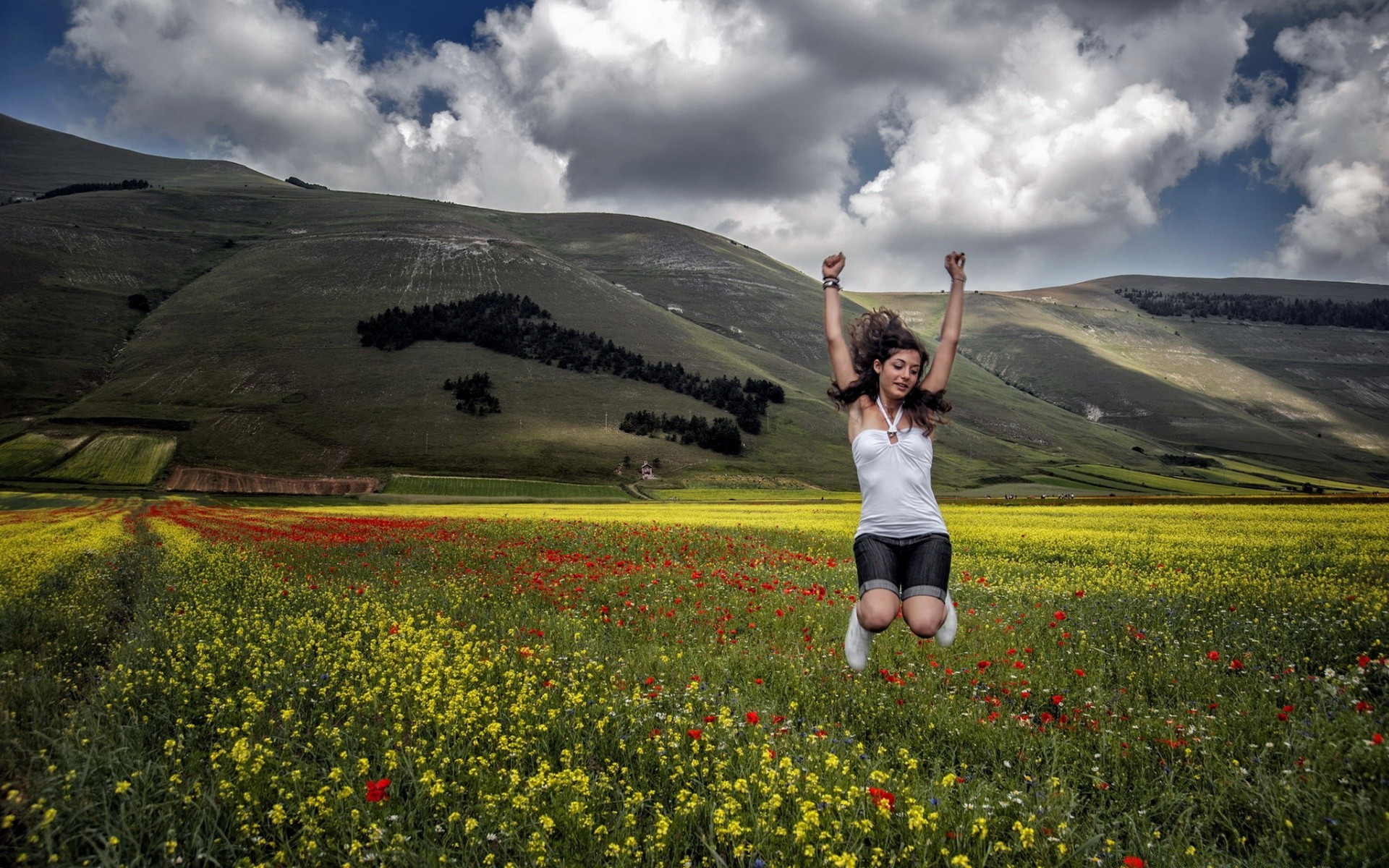 Paisaje con una chica saltando en el campo en el fondo de las montañas