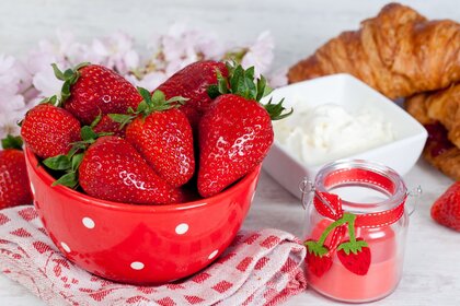 Tazón de fresas sobre la mesa y croissant