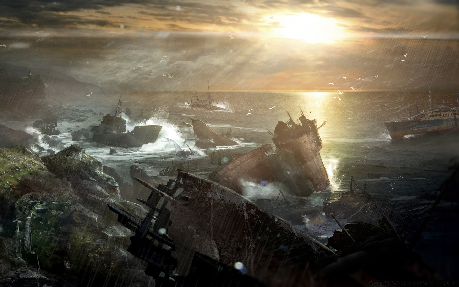 Mar emocionante cerca de la costa, donde los barcos y otros equipos son abandonados