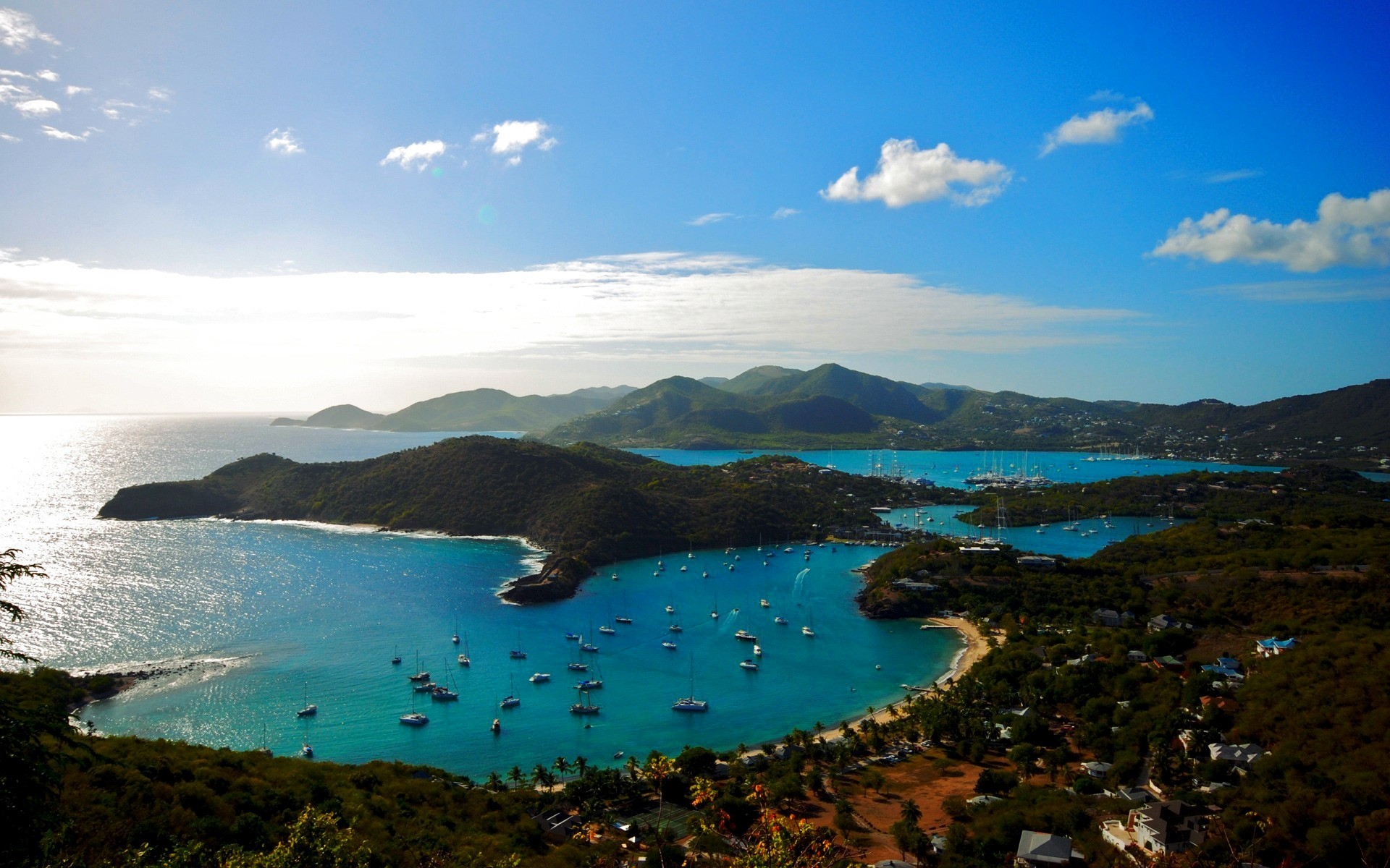 Bahía con barcos. Mar transparente, azul y bahía con las naves