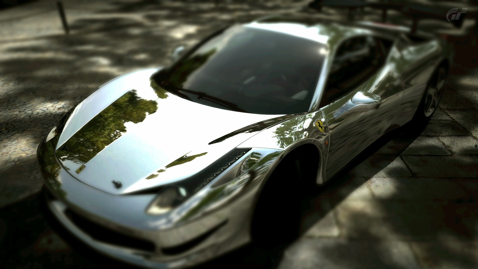 Coche retro aparcado en una cafetería en el juego de ordenador gran turismo