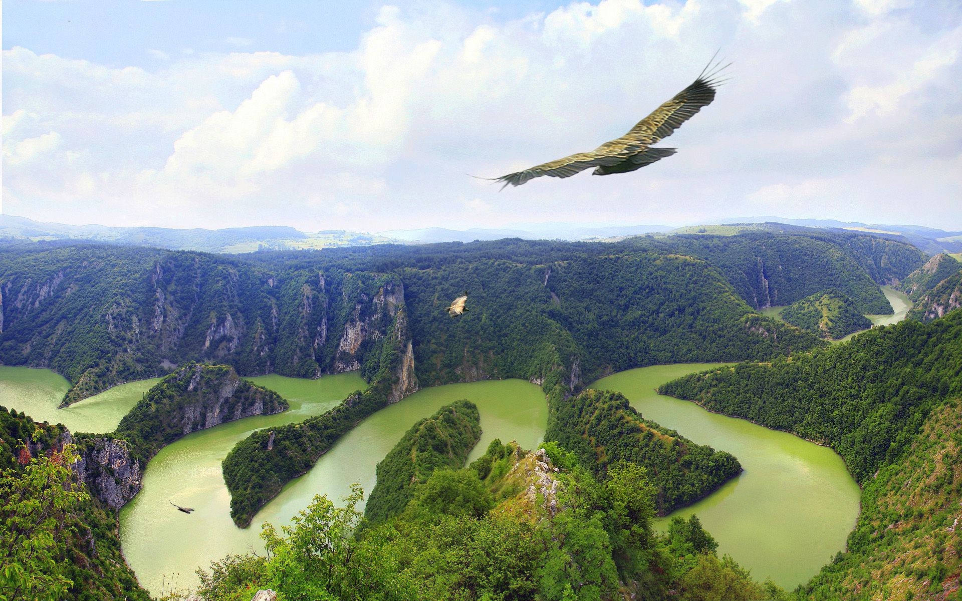 Paisaje con una hermosa cascada sobre el fondo de un bosque verdePaisaje con una hermosa cascada sobre el fondo de un bosque verde