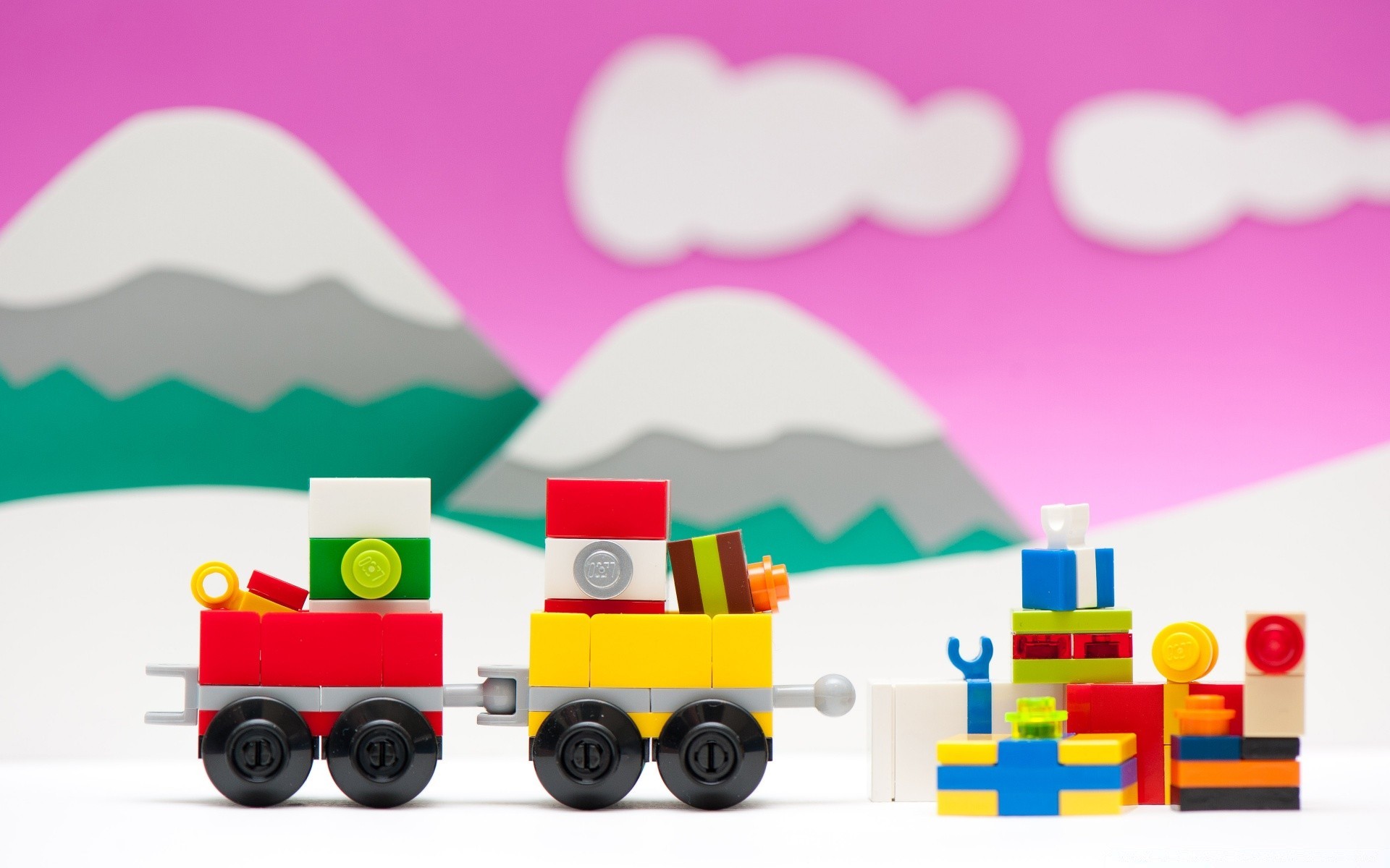 Locomotora de vapor con regalos en el fondo de las montañas
