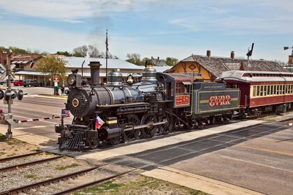 Tren antiguo cruza carretera asfaltada