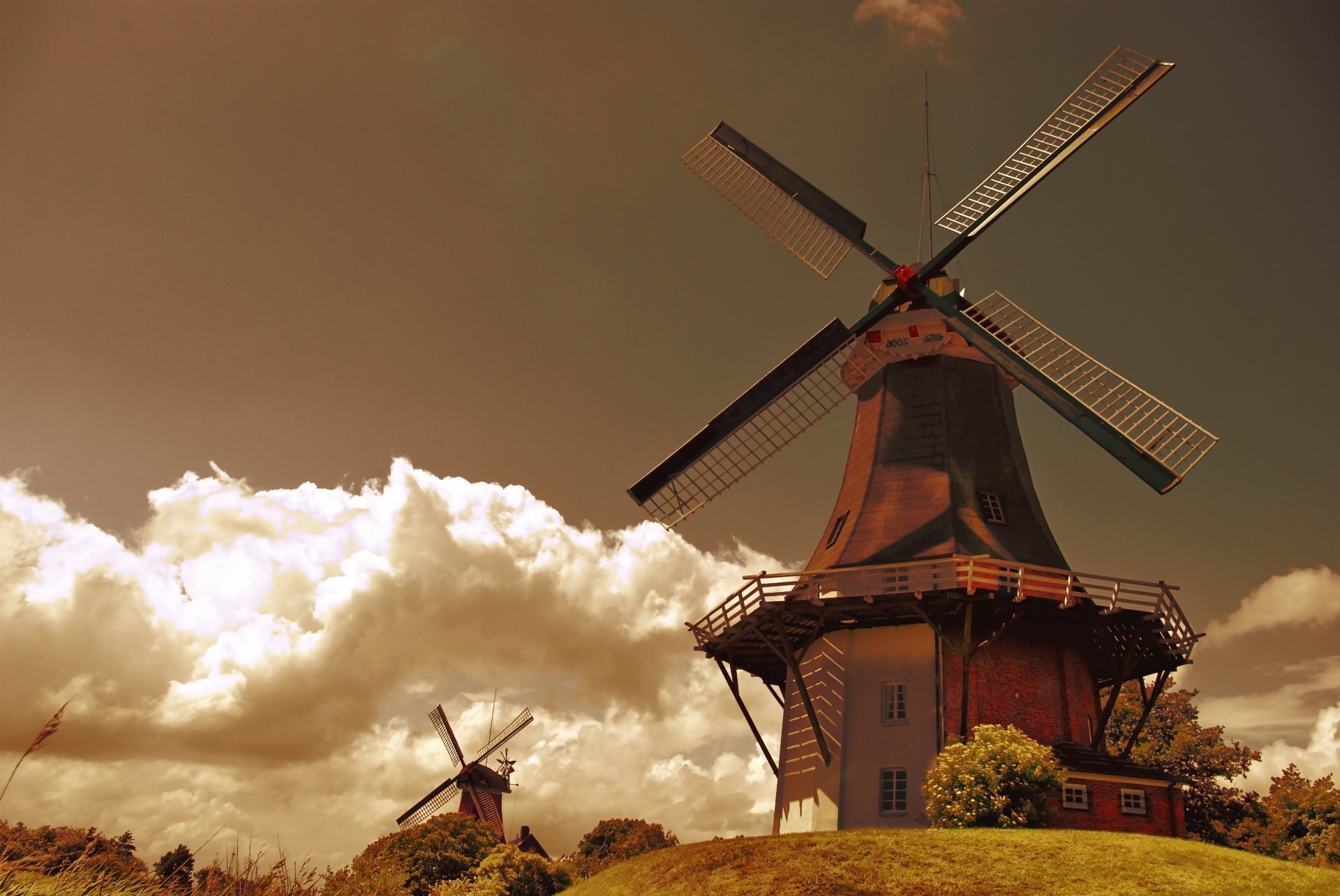 Puesta de sol reflejada en el agua con molinos de viento en la orilla