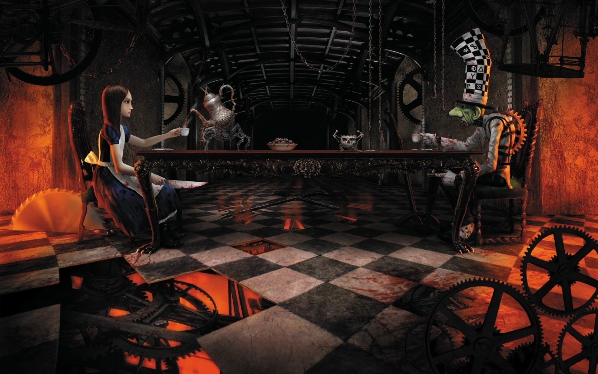 Personajes en el juego juntos en una mesa en una habitación oscura