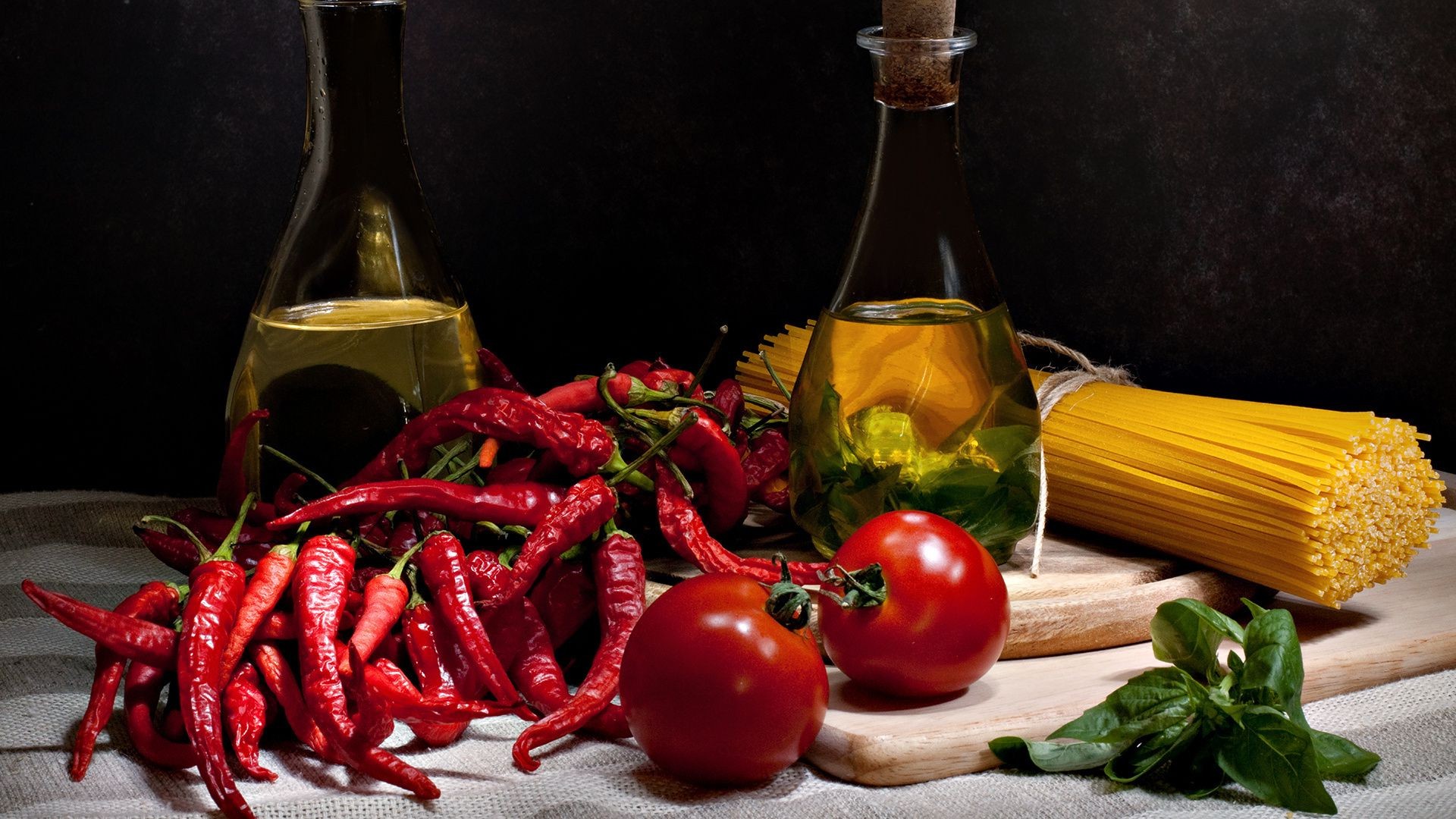 Conjunto gourmet. Tomates, chiles y aceite de oliva