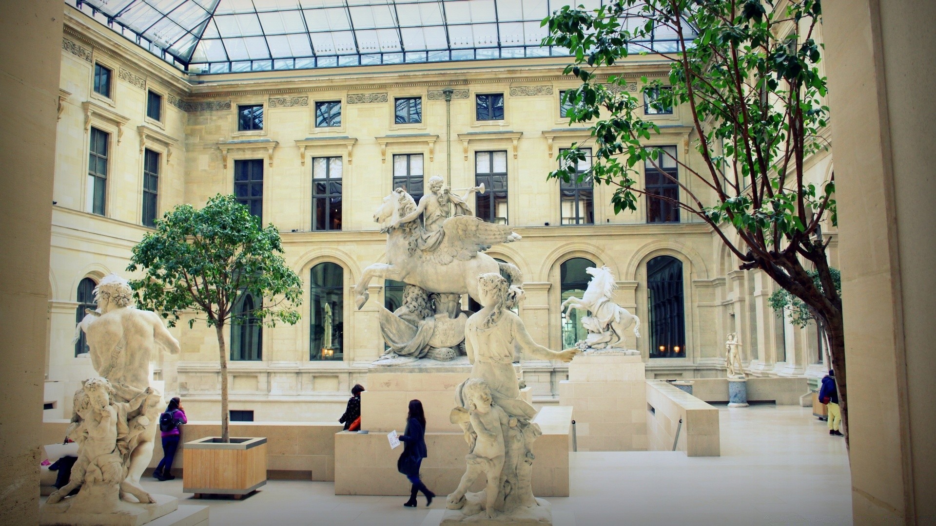 Esculturas en el patio, la gente y la ciudad