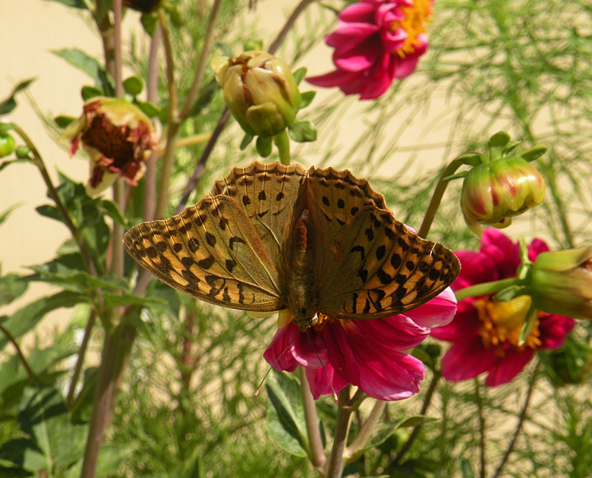 Mariposa sobre una flor sobre un fondo verde