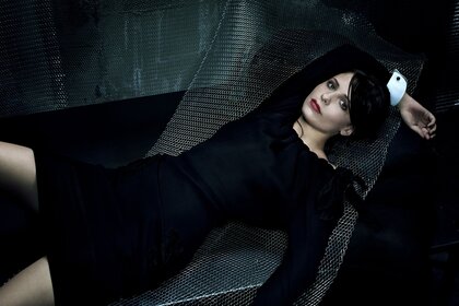 Modelo en vestido negro sentado en un círculo