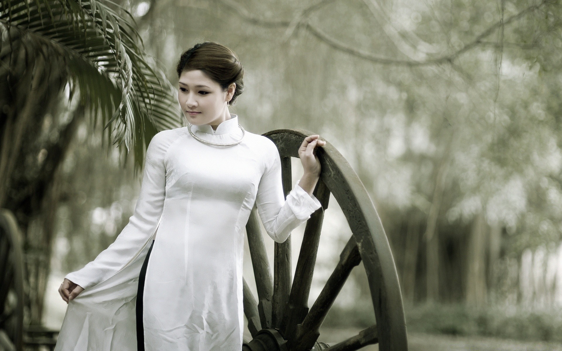 Chica asiática en vestido blanco cubierto apoya su mano en una gran rueda de maderaChica asiática en vestido blanco cubierto apoya su mano en una gran rueda de madera
