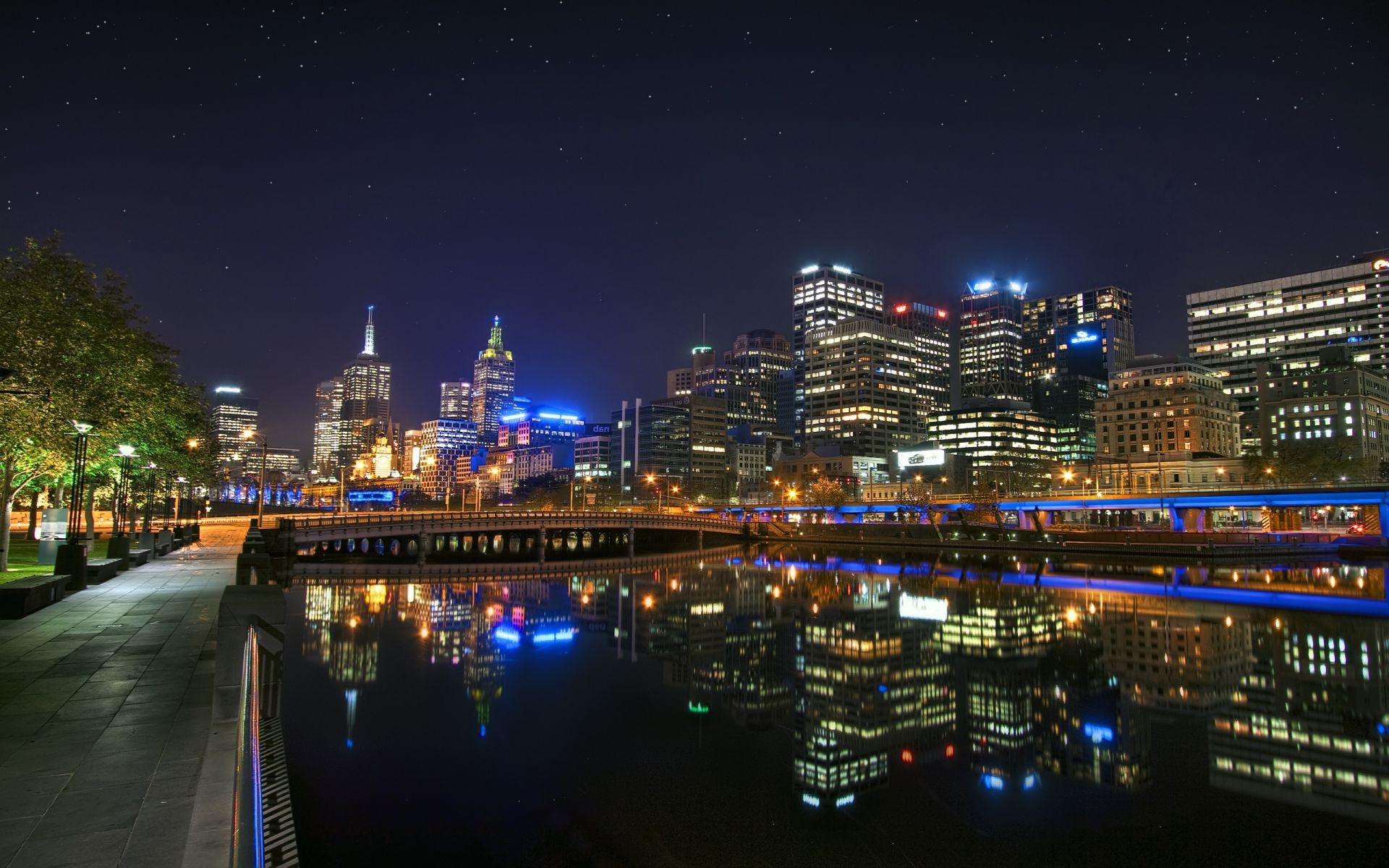 Arquitectura de la ciudad nocturna con un largo puente sobre la superficie del agua