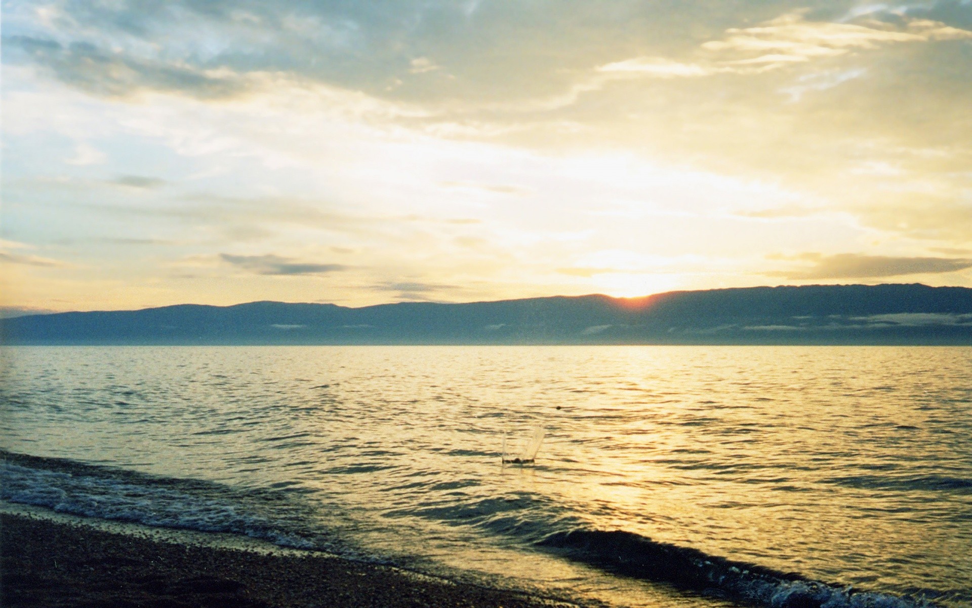 Foto de las montañas en la niebla en el fondo de la puesta de solFoto de las montañas en la niebla en el fondo de la puesta de sol