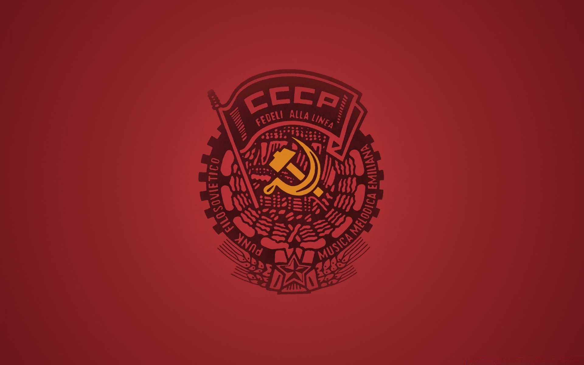 Escudo de armas con martillo y hoz sobre fondo rojo