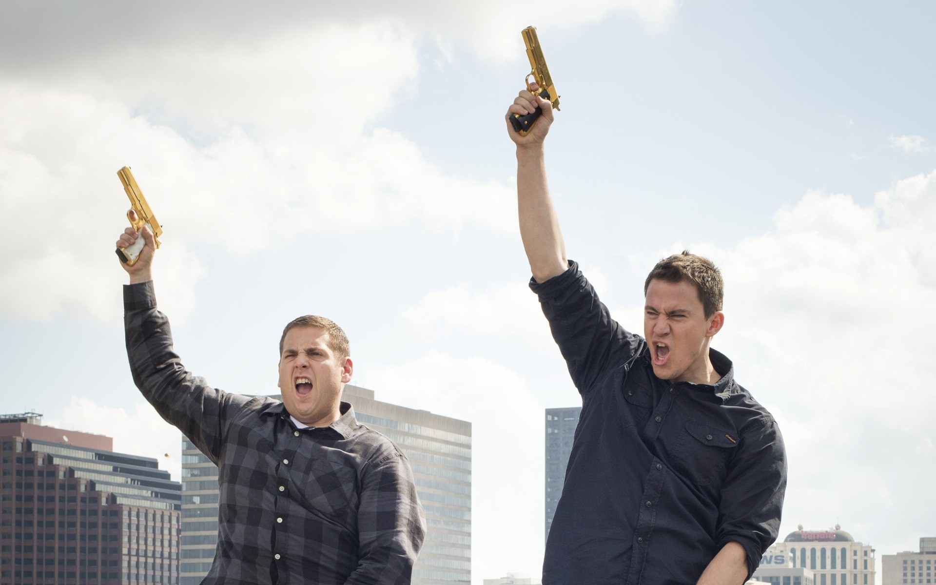 Dos amigos al aire libre haciendo alarde de pistolas