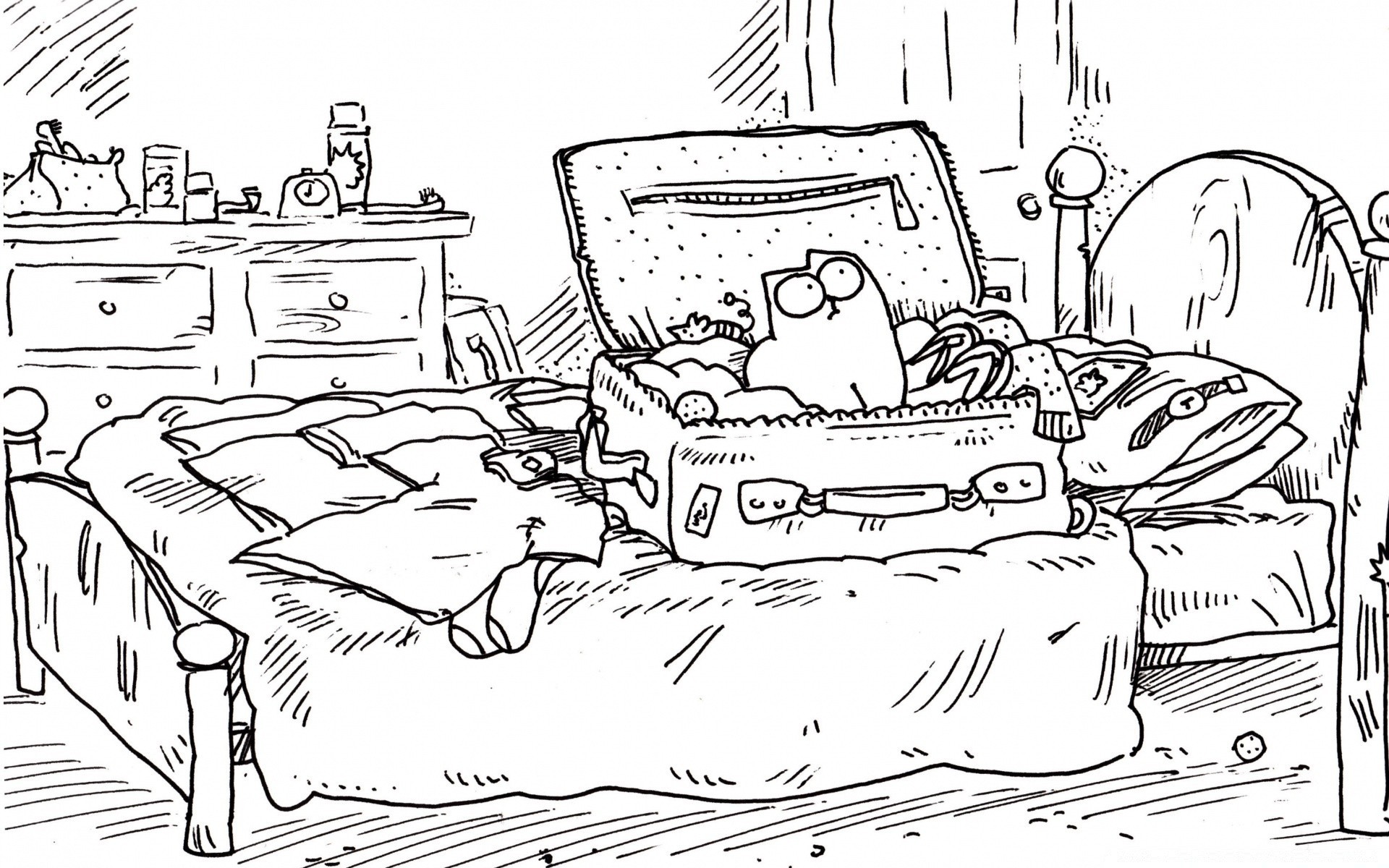 Gato simon en una maleta en la cama, papel pintado en blanco y negro