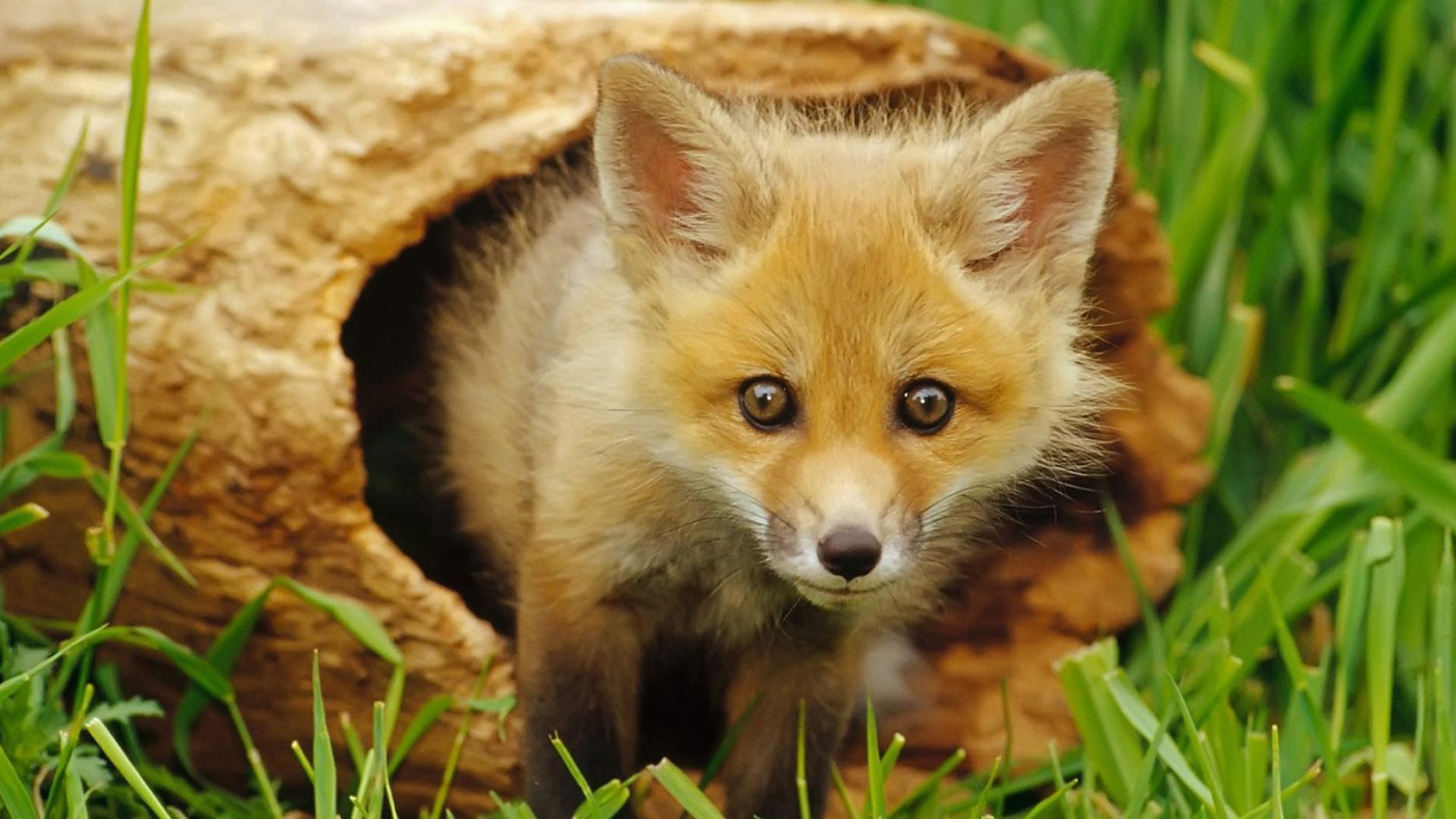 Un zorro sale de un viejo hueco de madera